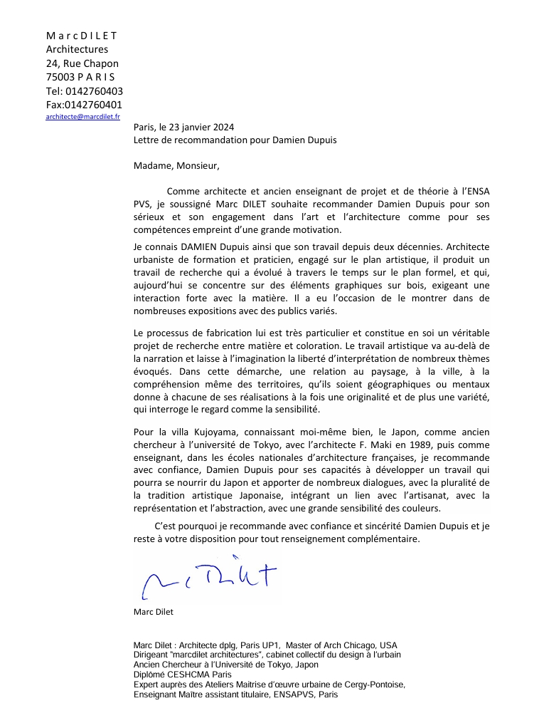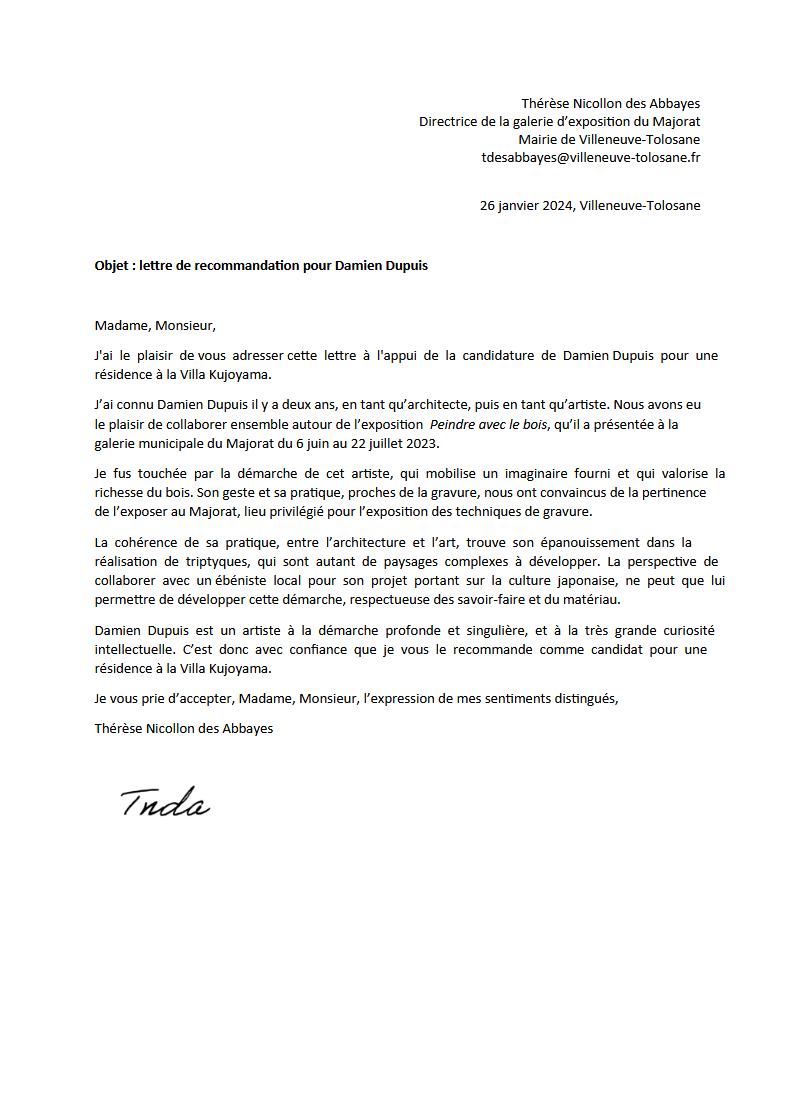 Lettre de recommandation pour la Villa Kujoyama